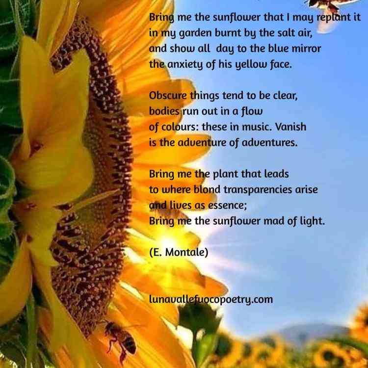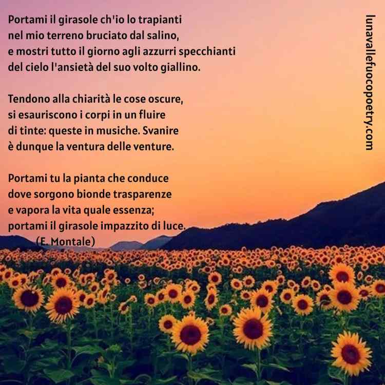 Così nella poesia “Portami il girasole” di E. Montale l’estate ci offre “il girasole impazzito di luce” per cui il poeta rivolgendosi a questo fiore magnifico chiede una sorta di illuminazione superiore che non ha niente a che vedere con le ricchezze materiali, anzi chiede di distaccarsi dall’effimero per innalzarsi verso il cielo, verso il sublime. Il girasole diviene il simbolo della luminosità, una vera poesia di luce che porta alla pazzia poiché esce dall’abituale razionalità della materia per tendere all’illuminazione nell’essenza della visione, nell’atto del “vedere”.